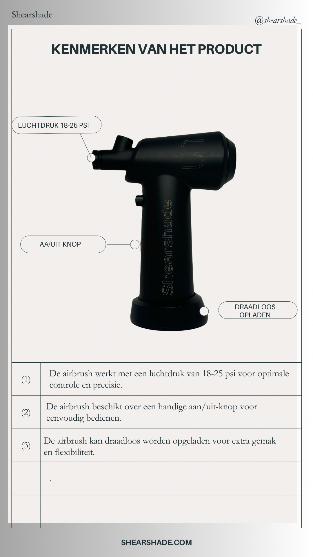Transformeer je kapperservaring met de ShearShade Airbrush, ontworpen voor ultieme precisie en gemak. Onze airbrush onderscheidt zich door een unieke eigenschap: je hoeft de spuitdruk niet aan te passen. Met een constante luchtdruk van 18 psi garandeert de ShearShade Airbrush een consistente en professionele afwerking elke keer weer.